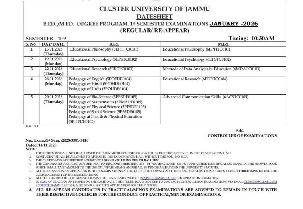 The Cluster University of Jammu (CLUJ) has officially announced the date sheet for the B.Ed and M.Ed Degree Program 1st Semester Examination January 2026 for both Regular and Re-appear candidates. The examination schedule, issued on 14 of November 2025, provides complete details of subject-wise exam dates, timings, and crucial guidelines for all students enrolled under the semester scheme. As per the notification, the B.Ed and M.Ed 1st semester examinations for January 2026 will commence from 15 of January 2026 and all papers will be conducted at 10:30 AM. Students pursuing teacher education programs from Cluster University Jammu are advised to carefully go through the date sheet and follow the instructions issued by the Controller of Examinations. This article provides a detailed breakdown of the date sheet, subject-wise exam schedule, important instructions, and essential guidelines for smooth conduct of the B.Ed M.Ed Degree Program 1st Semester Examination January 2026.