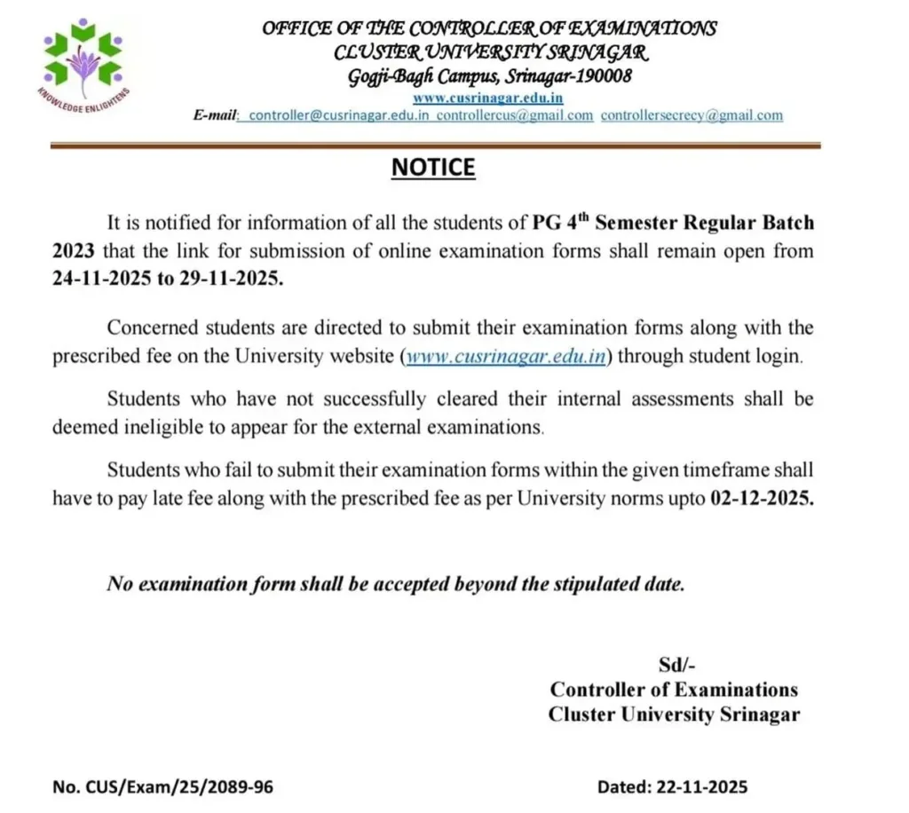The Cluster University Srinagar – CUS has published an official notification for all students of PG 4th Semester Regular Batch 2023 that is announcing the schedule for online submission of examination forms for the upcoming semester-end examinations. This notification is for the students of postgraduate who are preparing to appear in the external examinations and must complete their exam formalities within the prescribed timeline. The university has clearly outlined the form submission dates, eligibility requirements, late fee deadlines and important instructions that every student must carefully follow. In this detailed article, you will find all essential information related to the notification issued by the Controller of Examinations on 22 of November 2025.