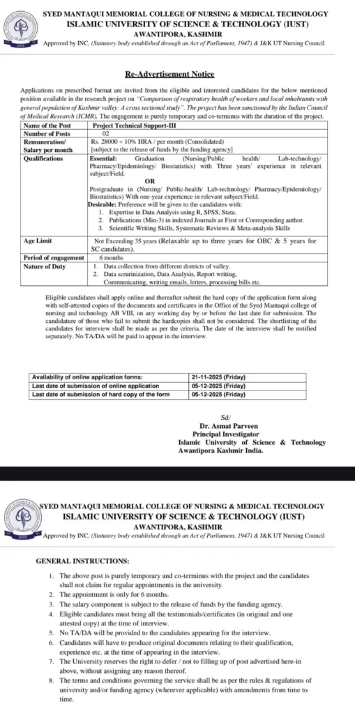 The Syed Mantaqui Memorial College of Nursing and Medical Technology, under the Islamic University of Science & Technology – IUST Awantipora has issued a Re-Advertisement Notice for the recruitment of Project Technical Support-III positions. These vacancies are available in a prestigious research project titled – Comparison of respiratory health of workers and local inhabitants with general population of Kashmir valley – A cross-sectional study. The project is funded by the Indian Council of Medical Research – ICMR. The engagement is purely temporary and co-terminous with the project duration. Candidate with graduate or postgraduate in Nursing, Public Health, Lab Technology, Epidemiology, Biostatistics, Pharmacy or related fields are having an excellent opportunity to gain real-time field experience and contribute to an important health study in Kashmir.