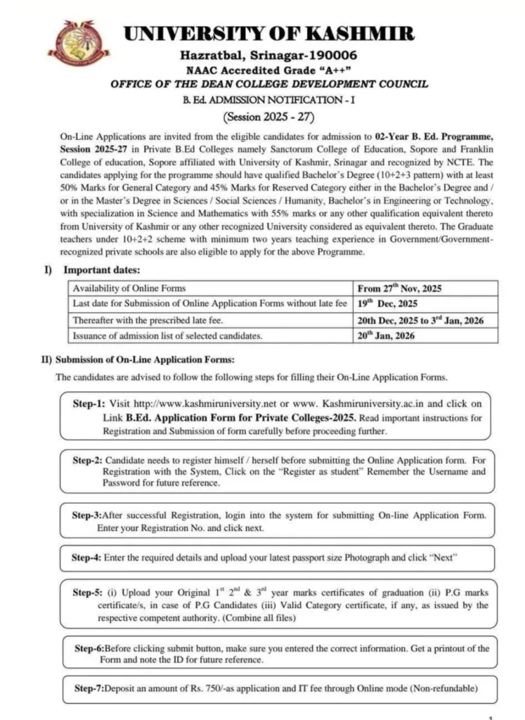 The University of Kashmir has officially announced the B.Ed Admission Notification – I for the Session 2025–27 and is inviting online applications from eligible candidates for admission to the 2-Year B.Ed Programme offered by its affiliated private colleges. This notification covers Sanctorum College of Education, Sopore, and Franklin College of Education, Sopore both recognized by NCTE and affiliated with the University of Kashmir. If you are planning to pursue a Bachelor of Education degree and looking for admission under the University of Kashmir, this article provides complete details, including eligibility, important dates, fee structure, and step-by-step instructions to fill the online form.
